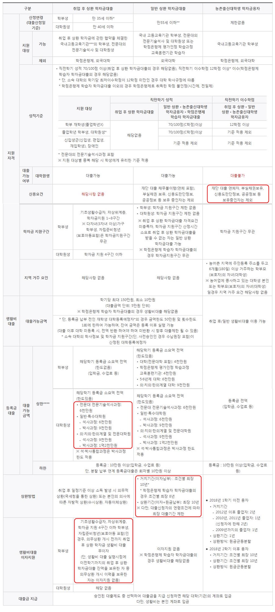 ● 농촌출신대학생 학자금융자 : 조건별 최장 기간 내 원금균등분할상환