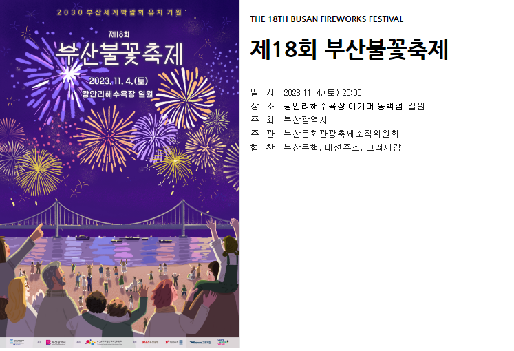 이번 부산불꽃축제는 11월 4일 토요일 저녁 8시에 열립니다.
