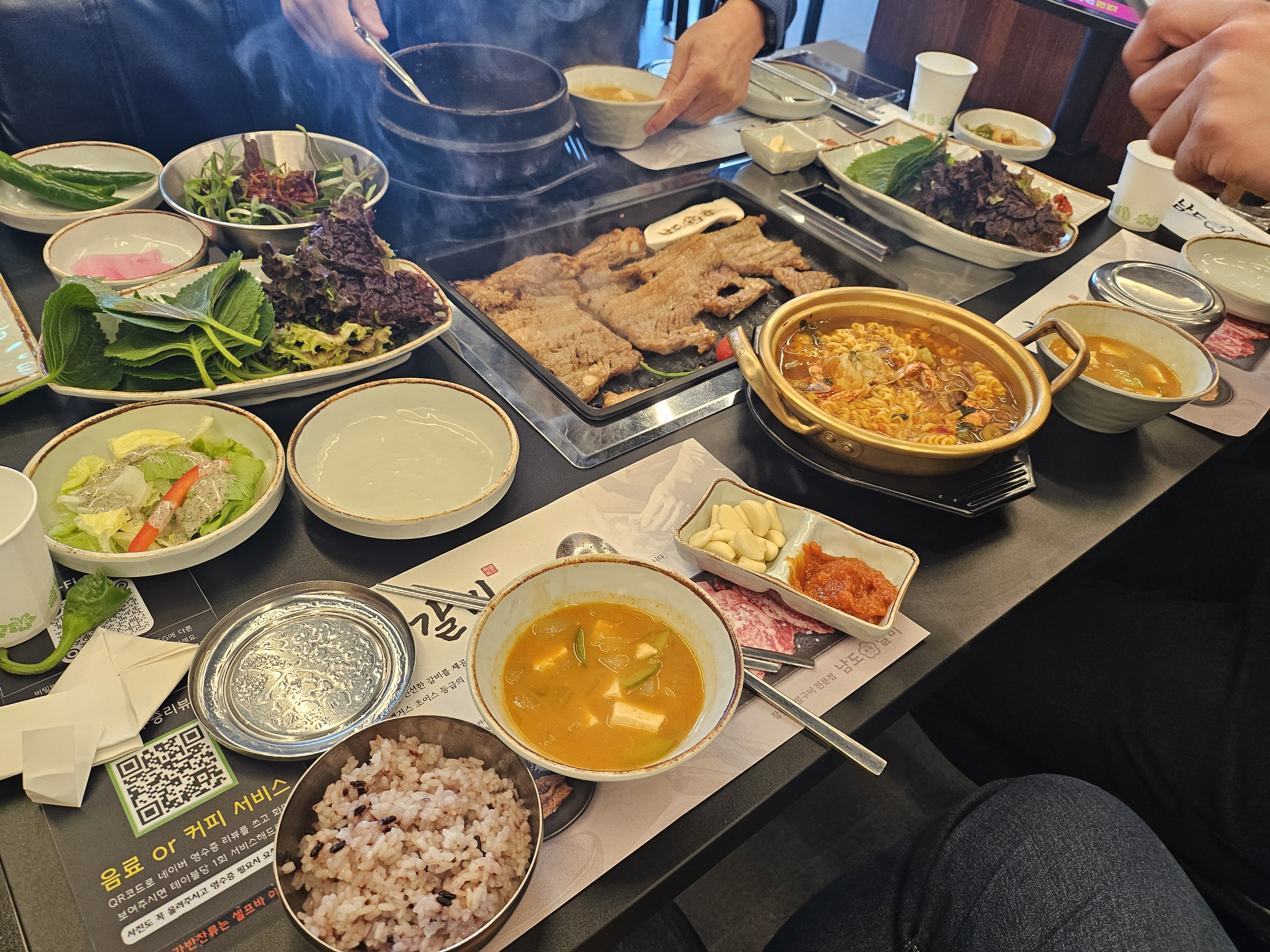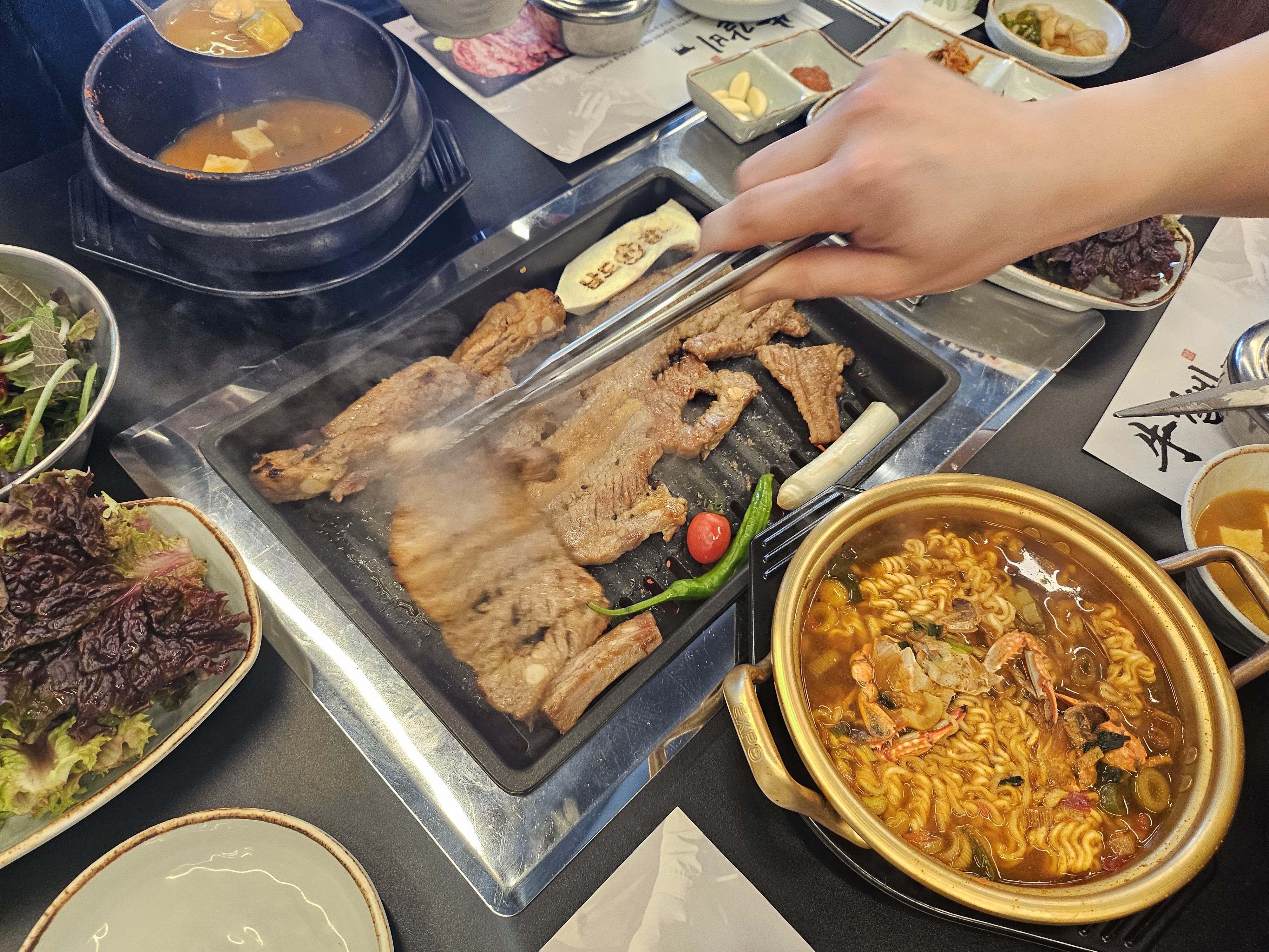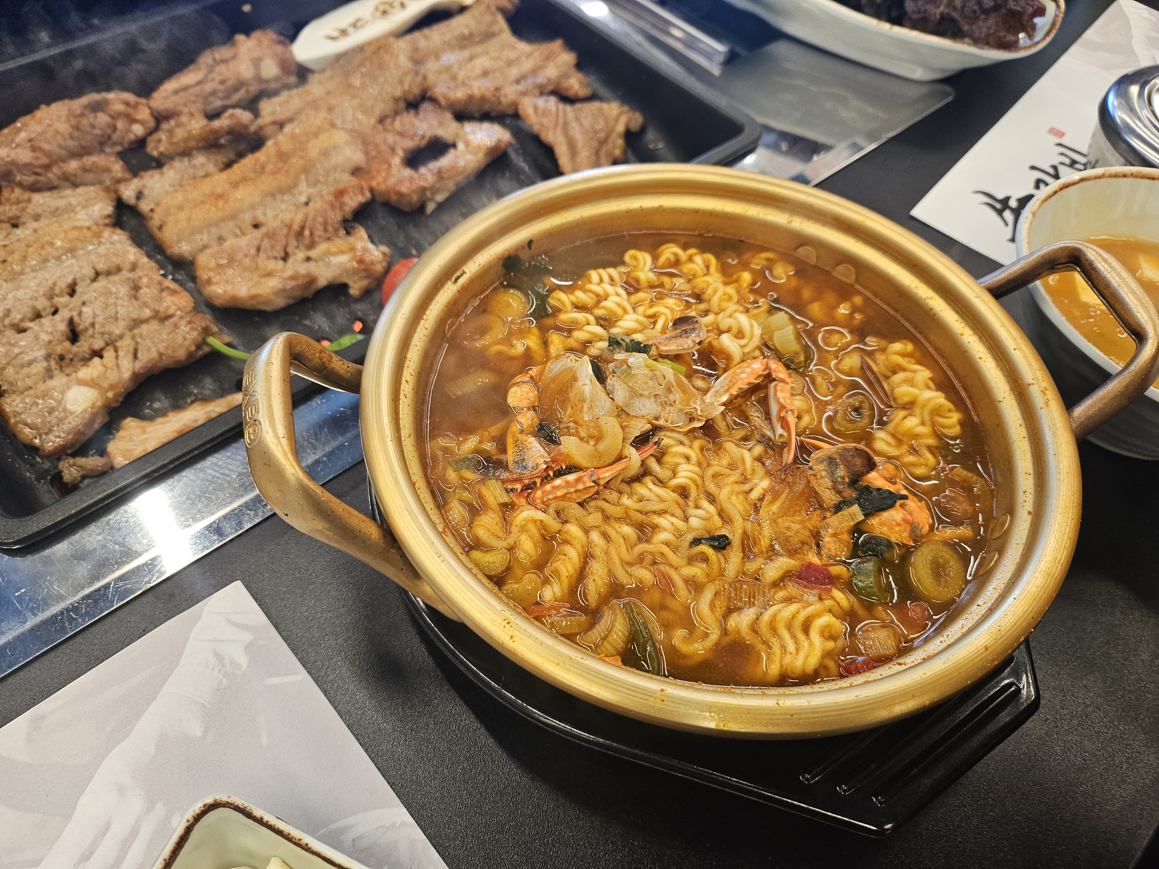 특이하게도 고기도 나오고 라면도 동시에 나온다.