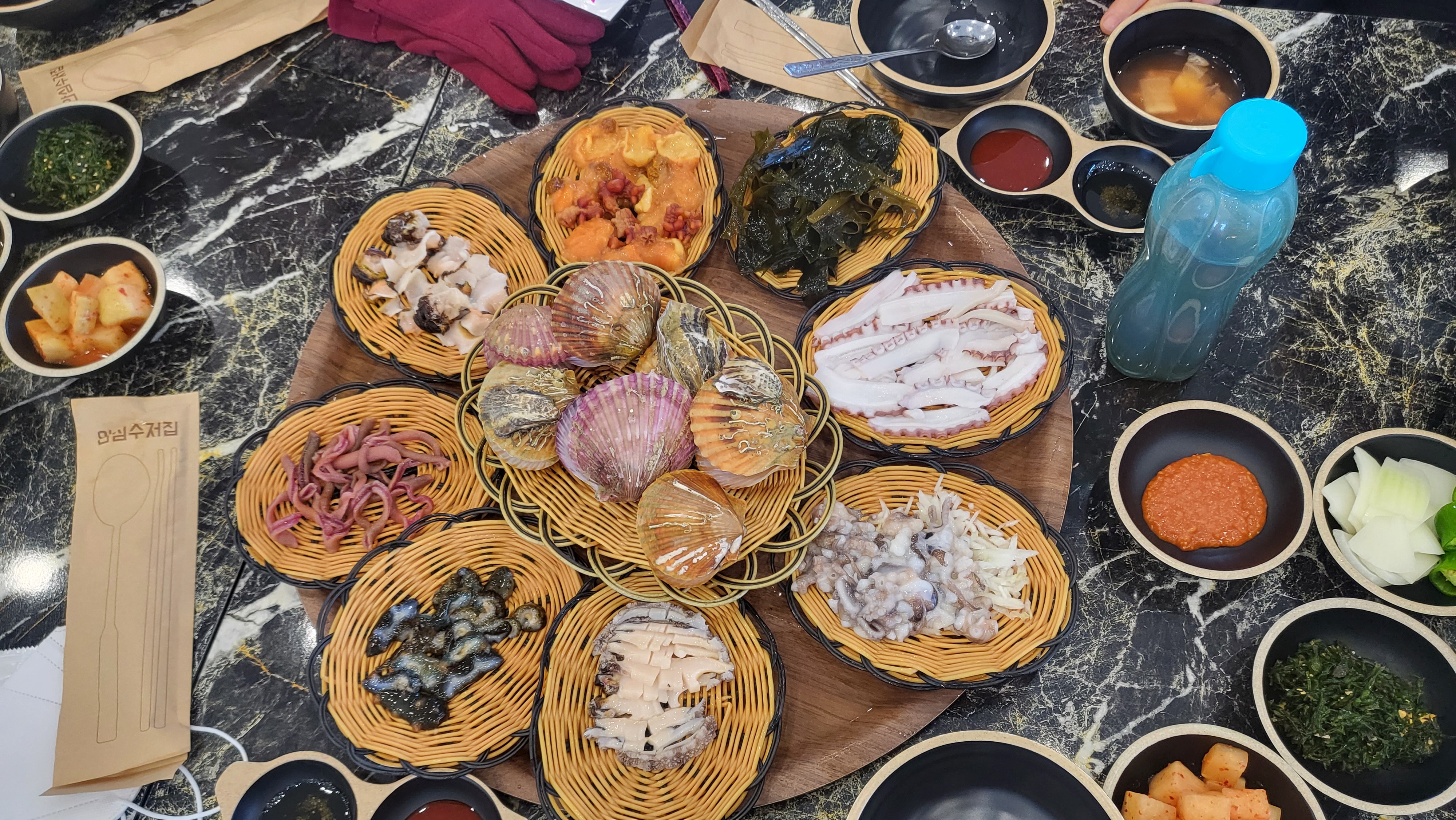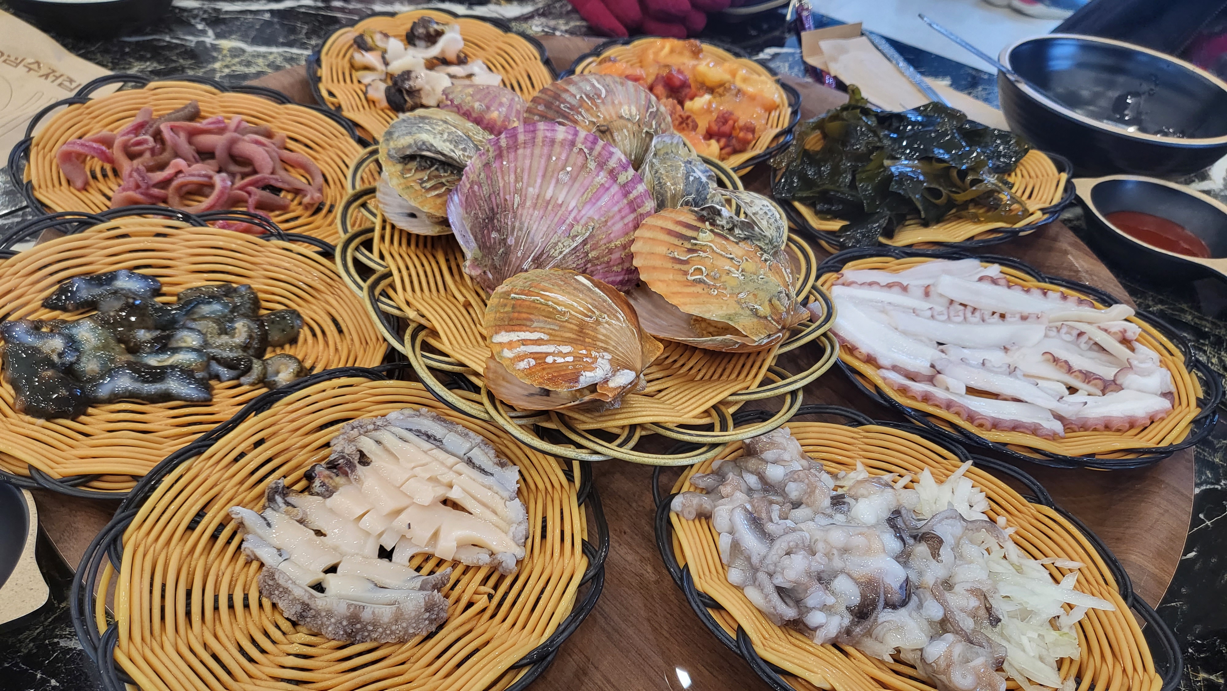 종류는 멍게, 문어, 낙지, 전복, 해삼, 개불, 가리비 등등 다양하게