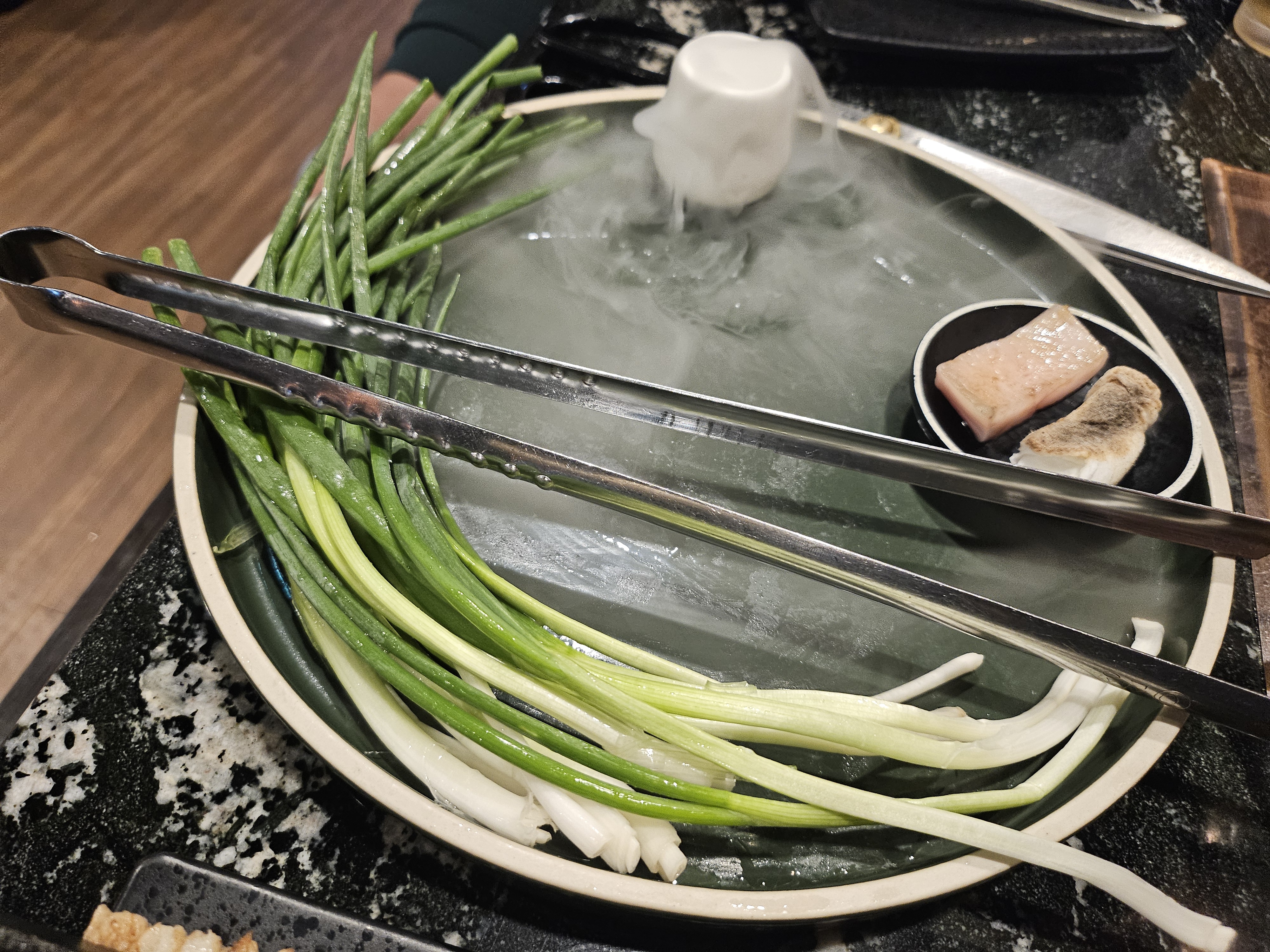 이렇게 드라이아이스를 이용해서 연기를 머금은 쟁반이 도착한다.