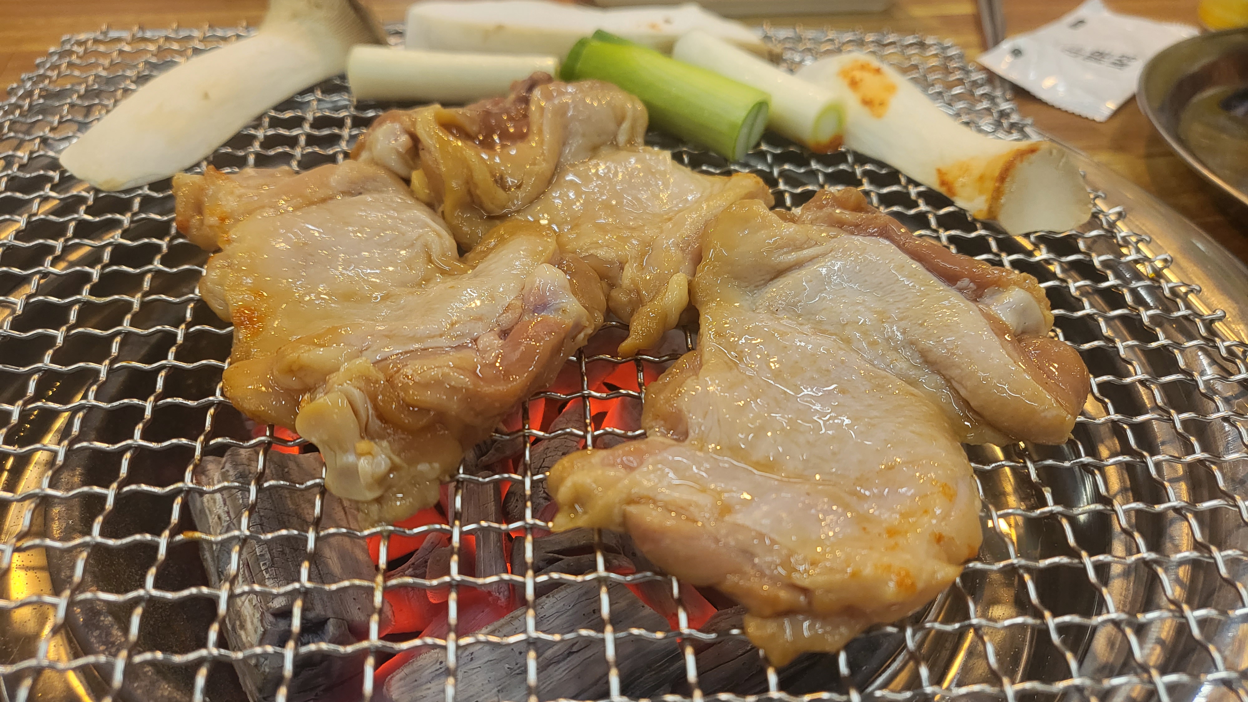 좋은 숯에서 좋은 닭고기가 익어간다.
