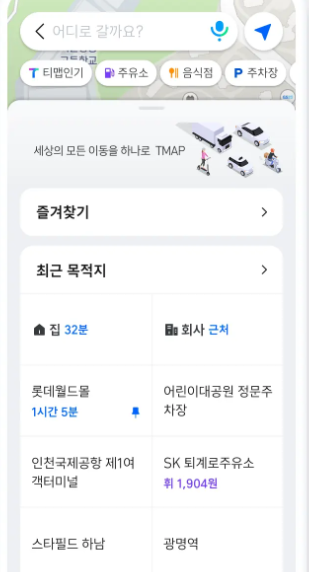 T맵은 네비게이션 앱으로 실시간 교통 정보와 그것을 바탕으로 최적의 경로 탐색 기능을 가지고 있습니다.